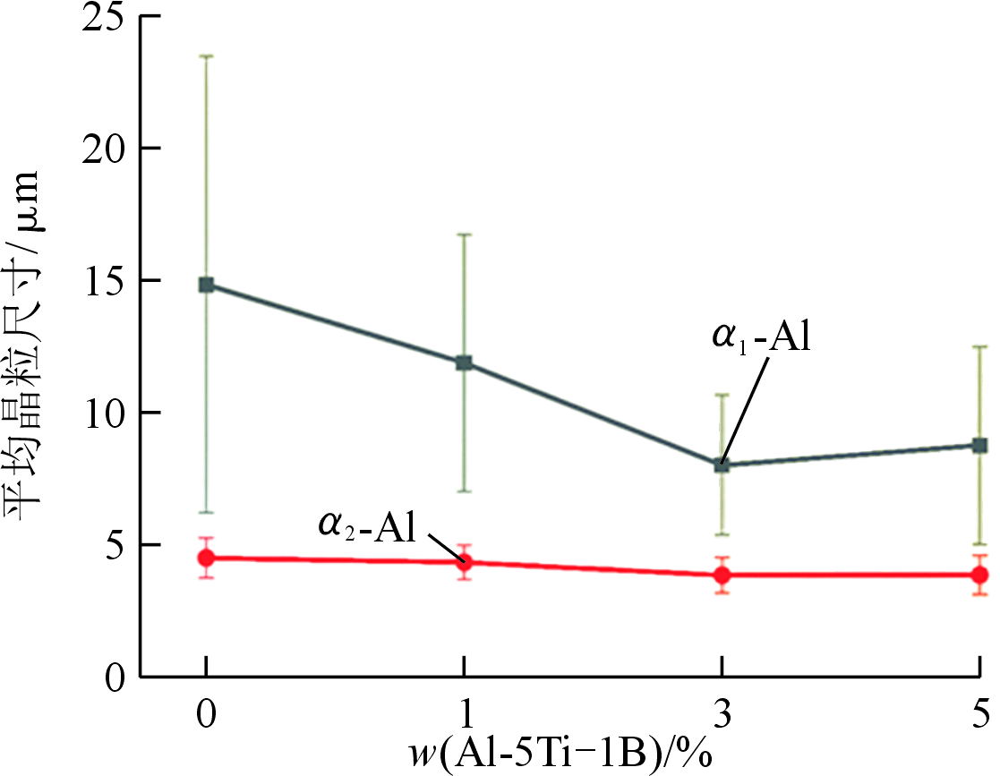 圖6 不同Al-5Ti-1B含量的TiB2/ADC12鋁合金α1-Al和α2-Al平均晶粒尺寸