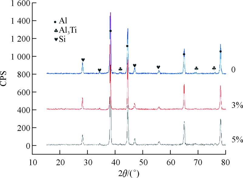 圖9 不同Al-5Ti-1B添加量下TiB2/ADC12鋁合金XRD圖譜