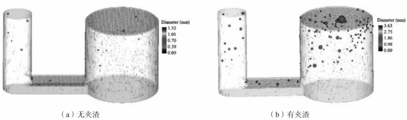 圖6 渣氣復合體粒徑分布和流場 圖6a、b為充型初始階段,外部引入的渣粒隨金屬液快速進入型腔中,此時在澆注系統中的渣粒體積變化不大,且呈彌散形分布,而在圓柱試樣上層液面區域開始出現粒子的聚合長大。其原因是由于直澆道和橫澆道區域的流速較大,渣粒之間的聚合長大不明顯。而在試樣上部液面區域的流速顯著降低,使得渣粒之間的碰撞聚合長大較為明顯。由于充型初期金屬液溫度變化不大,在此期間氫氣在渣粒表面的吸附量也較小,在這個階段中渣氣復合體的體積變化主要是以渣粒間的聚合長大為主。圖6c-e為充型中后期階段,直澆道與橫澆道內的流速有所減緩,可以看到因渣氣復合而形成的粒子體積增加。同時內澆口區域的流速顯著降低,這使得該區域開始出現渣氣復合體的快速聚合長大(圖6e)。在此期間,渣氣復合體不斷向上方運動,其聚合體積進一步加大,從而在試樣頂部可以看到有較多大體積的渣氣復合體的存在。圖6f表示完全凝固后渣氣孔的分布,從圖中可以看到,直澆道和橫澆道內的渣氣復合體體積有了明顯的增加。同時,試樣頂部的渣氣孔分布也較為明顯,且體積較大,而試樣中下部區域的渣氣孔數量較少,且體積較小。其原因是由于在凝固階段金屬液溫度不斷降低,促使熔體中的氫大量析出并吸附于渣粒表面,渣氣復合體中氫氣含量的不斷上升使得其密度減小,促進了渣氣復合體向試樣上部的移動。與試驗結果對比,模型計算所獲得的渣氣孔分布規律及形貌特征與實際基本吻合。 2.4 夾渣對渣氣孔形成的影響 為了研究外來夾雜的引入對鑄件中渣氣孔形成和分布的影響,采用相同的工藝條件分別計算了無夾渣和有夾渣進入的條件下鑄件內氣孔和渣氣孔的分布,結果如圖7所示。