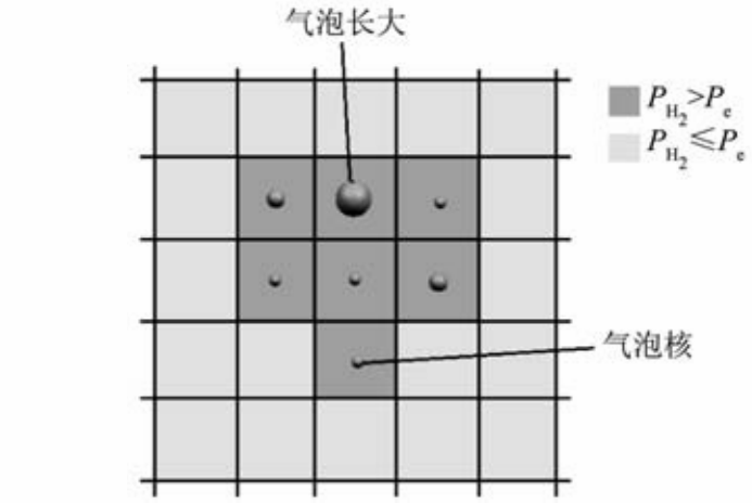 圖1 氫氣形核網格模型 當網格內的氫分壓PH2大于此處最小形核壓力Pe時,在該網格區域中形成一個具有初始半徑的氫氣泡核,溫度不斷下降使得網格內氫溶解度下降,氣泡核不斷吸收析出氫后體積增大,其氣泡體積可表示為: