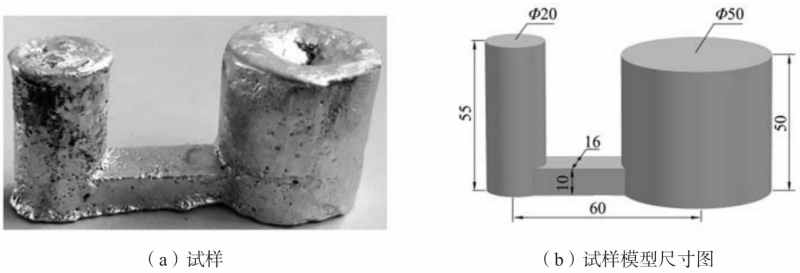 式中:角標i表示x、y、z分量;ds為復合體中渣粒的直徑;dp為復合體直徑;ui為金屬液速度分量;upi為復合體的速度分量;t為時間;ρs為復合體中固體渣的密度;Fpi為金屬液內壓力梯度傳遞給復合體的作用力分量;Fgi為復合體重力分量;FDi為金屬液對復合體的運動阻力分量;Fbi表示復合體所受浮力分量;P為金屬液壓力;gi為重力加速度分量;CD為阻力系數。 02 渣氣孔的形成及演變分析 2.1 試樣結構及澆注工藝 采用砂型重力鑄造方法澆注圓柱形試樣,底注式結構有利于渣氣孔的形成及聚合運動。試樣材料為ZL102合金,澆注溫度為720 ℃,充型速度為0.3 kg/s。試驗中通過外加Al2O3顆粒(40目,密度3.9 g/cm³)來模擬鋁液中的外來夾雜物。Al2O3顆粒加入量為1.4 g,折算成顆粒數約為2 000顆,試樣及澆注系統形態尺寸如圖3所示。
