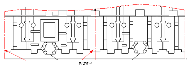圖3:鎂合金殼體冷鐵布置示意圖 在工藝設計時,在凸臺部位一般都設置冷鐵加強激冷以減小熱節,但當凸臺過厚時容易產生疏松缺陷,即使增加冷鐵厚度也很難消除。在凸臺部位設計補縮澆道增加補縮,可有效消除疏松缺陷。 澆注溫度 降低澆注溫度可減輕鑄件過熱,有利于降低疏松等級,但不是溫度越低越好,溫度過低會降低補縮效果。一般情況下,當澆注大直徑立筒時可適當降低澆注溫度,澆注小直徑立筒時,澆注溫度要適當提高。 澆注工藝 在保證鑄型充滿的前提下,充型速度一般選下限,既可以避免充型時產生紊流、飛濺造成卷氣,又能延長金屬液對澆道的烘烤時間,從而調整鑄件凝固速度,強化順序凝固效果。根據生產經驗,升液速度要高于充型速度。 增加保壓壓力可以強化合金凝固期間補縮能力,從而填充枝晶間的微縮孔,但壓力過大會導致鑄件變形、粘砂和跑火等,因此壓力也不是越大越好,一般保壓壓力為30kPa~60kPa。 2、偏析的產生和防止 鎂合金的偏析一般是成分偏析,常會導致鑄件直接報廢。合金熔煉工藝和鑄件凝固條件都會引起鑄件產生偏析缺陷。通過調整精煉溫度、改善激冷能力以及降低澆注溫度,可有效降低偏析缺陷產生傾向。 精煉溫度 鎂合金熔煉過程中,相對鎂合金熔點高的其他金屬是重金屬。重金屬元素偏析的現象是由于重金屬元素未能完全融入合金液中,提高精煉溫度,重金屬元素能夠更好地熔入合金液中,鑄件中重金屬元素的偏析現象明顯減少。 激冷能力及澆注溫度 成分偏析易產生于厚壁冷鐵間隙處和厚壁間的薄壁處,在這些部位放置石墨砂加強激冷,減輕局部過熱可有效防止偏析缺陷的產生。降低澆注溫度,縮短合金凝固時間,降低合金過冷度,防止重金屬在凝固過程中析出,減輕了偏析的產生。在耐熱鎂合金殼體的生產中,降低澆注溫度,偏析缺陷得到了極大改善。 3、裂紋的產生和防止 裂紋是鑄件致命的鑄造缺陷,在鑄件上呈現直的或者曲折的隙縫與裂口,斷面處被氧化呈黑色或者深灰色,易產生在凸臺的厚薄交接處和下端框處,工藝設計、原材料質量和冷鐵位置都會導致裂紋缺陷。 工藝設計 當鑄件設計多個相鄰較近的凸臺時,見圖4,在凸臺間的薄壁處易產生裂紋缺陷。通過設計合理的防裂拉筋,可有效消除裂紋缺陷。