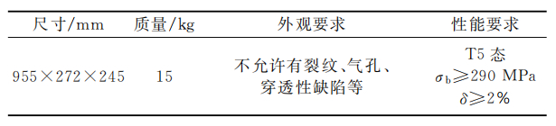 殼體鑄件材質(zhì)為ZL114A,其化學成分為(質(zhì)量分數(shù)):6.5%~7.5% 的Si,0.25%~0.6%的 Mg,0.15%~0.2%的 Ti,0.05%~0.1%的 Fe,其余為Al,鑄件質(zhì)量要求見表1。