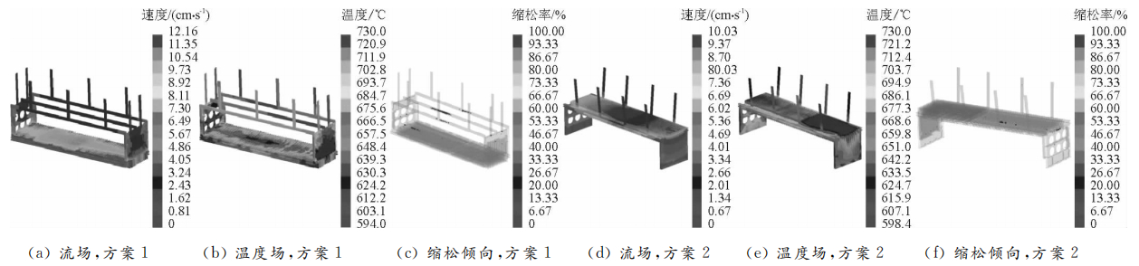 CAE模擬從充型結束溫度、各部位充型時間來對比方案的溫度場分布是否均勻,鑄件底板部位是否充型迅速,并根據(jù)縮松情況判斷鑄件可能出現(xiàn)缺陷的部位,見圖4。可以看出,①充型結束方案1溫度場更均勻;②根據(jù)鑄件各部位充滿時間判斷鑄件重要部位底板,方案1充型更平穩(wěn);③去除后,鑄件縮松缺陷相當。