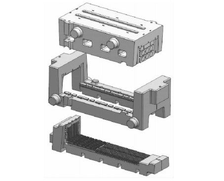 采用3D打印砂型,通過CAE模擬,對比選擇確定 澆注位置方案后,使用 UG建模軟件進行砂型設計,設 計為3塊砂芯,見圖5。使用4根螺桿卡具,其中底板 和側板處的筋板由1號芯成形,筋板中間不產(chǎn)生任何披 縫,無錯型,外觀良好。砂型長寬方向的正中心設計2 mm寬、2 mm深的凹槽,方便與低壓鑄造機升液管對 接。
