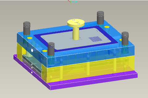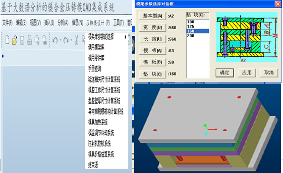 圖5:鎂合金壓鑄模CAD集成系統標準零件調用界面 3.6 壓鑄模三維總裝圖 根據系統引導,調用標準模架和標準件,再調用壓鑄模的工作零件。修改模具細節后,完成壓鑄模總體設計,三維總裝圖見圖6。壓鑄模總體設計完成后,經模具運動干涉檢查確認后,結合大數據分析進行壓鑄模整體結構審查驗證,對壓鑄模細節進行優化,修正,對后期壓鑄模試模可能出現的問題進行預判,排除因壓鑄設備以及壓鑄工藝造成壓鑄件缺陷的其他設計因素,有條件的廠家可以進行運動仿真以及充型過程模擬,分析模擬結果后,再對壓鑄模整體結構進行優化,確認整體無誤后,方可進行下一步數字化制造,以保證在后期壓鑄模試模中一次性成功,節約設計加工成本。模具設計在系統的指導下逐步計算和調用,無需對各個零件進行重復的模具建模和裝配,避免了大量的重復工作,大大縮短了模具設計時間。