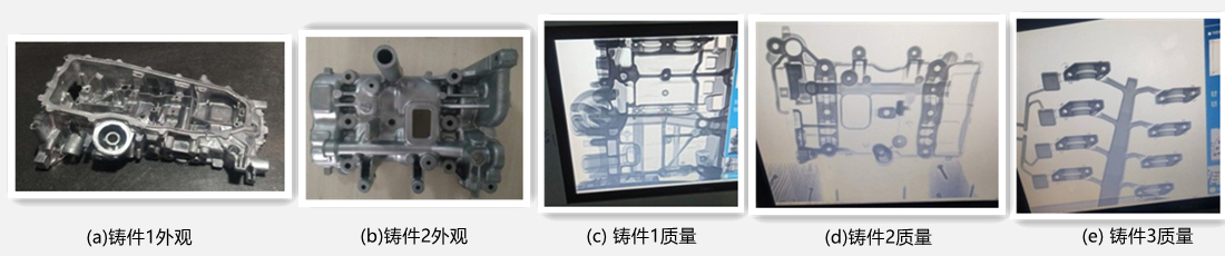 表2:鑄件1部分云端參數對比值 2.5 壓鑄運水的控制 在運水始端每一條都使用電磁閥控制直冷或普通點冷運水的時間,運水壓力0.4 MPa,運水溫度為30℃的純水。除了料槽、料套、沖頭、分流錐和料套強冷板是常開直冷外,其余所有直冷(隔水片),大點冷都是電磁閥控制,延時3 s,冷卻15 s,用以保證模具溫度。所有出針,從Φ4 mm到Φ14 mm(中心管從Φ1.5 mm到Φ5.5 mm)都采用超點冷控制,超點冷運水壓力為10 MPa,運水溫度為10 ℃(此處溫度不能設置過低,過低會帶走較多熱量,但是會易造成斷針),每組超點冷同等大小的針不超過8根(超過8根就超過直徑G1/2連接管道的直徑),所有針結合起來共計6組,除了Φ4 mm的點冷針均設置延時5 s,冷卻13 s,Φ4 mm的點冷針設置延時4 s,冷卻13 s,用以針對模具溫度場中需要快速降溫的區域降溫,減少熱節的產生。既保證模具溫度的平衡保溫,又能夠針對性消除局部熱節,保證產品質量。 3、新型多功能油底殼的質量情況 三款產品分為兩臺不同機臺生產,日產出按鑄件1到鑄件3分別高達980件/天,1500件/天,1.2萬件/天。三款產品直到最終的整體組裝,廠內綜合合格率高達97%以上。圖8是鑄件1、2的外觀和鑄件1、2、3的內部質量圖片。