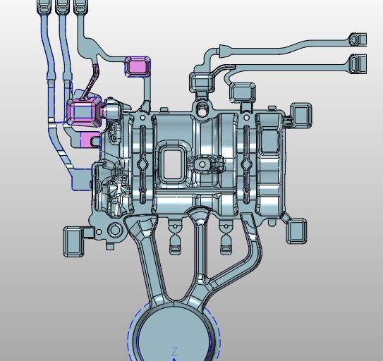 圖1:鑄件1澆道 鑄件2為平衡軸瓦蓋,造型相對簡單,只有中間兩路平衡軸油槽壁厚較厚?;阡X液流態簡單,為了節約成本,提高鋁液有效產出率,采取單邊進澆方案,并且進澆口就布在壁厚區域,以便進行補縮,見圖2。