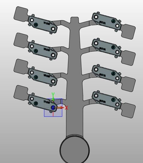 圖2:鑄件2澆道 鑄件3為單個平衡軸瓦蓋,零件較小(尺寸為63 mm×15 mm×25 mm),采用1腔8模的設計,進行填充進澆,見圖3。
