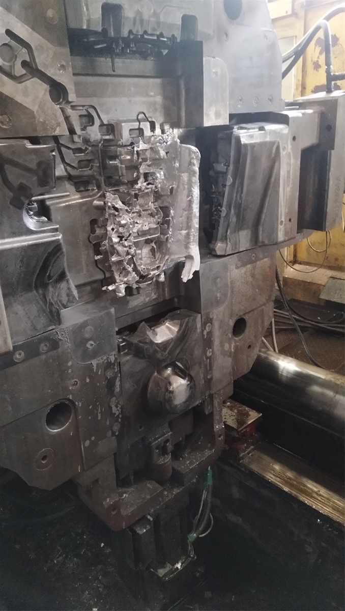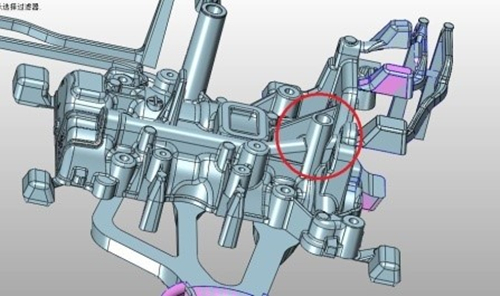 圖4:高真空填充試驗 1.4 模具的冷卻選擇 此鑄件1,使用了超點冷工藝和間歇式供水工藝。由于該鑄件生產需要保持較高的溫度,而且動模側有較多鑲件凸臺,既要保證高溫,又需要保證凸起的鑲件不至于形成熱節,造成收縮開裂等缺陷,就必須針對每個鑲件進行切割處理,并將點冷卻打入鑲件內部。同步外圍設備使用間歇式供水方式,在產品凝固階段,打開電磁閥,針對產品局部進行冷卻。這樣既獲得較高的溫度,又獲得很好的冷卻效果。超點冷工藝是針對壓鑄型芯針設計的,見圖1中箭頭所指位置。在壁厚區域中間出4 mm的針,會直接導致縮孔產生。針對4 mm針使用超點冷設計,能夠解決該螺紋孔的氣孔問題。同樣在其他交叉熱節部位,能出針的位置均使用超點冷針設計,很大程度上緩解了燒傷、氣孔、,斷針的問題。超點冷和間歇式供水的時間設定,需要考慮到材質打孔的壁厚,和其所處的位置。所以針對這些不同區域的點冷針都需要進行分區控制。 鑄件2只有平衡軸中間的4 mm油槽孔和入料口Φ8 mm的螺栓光孔,使用超點冷控制。因為鋁液沖刷過后,會在中間壁厚區域之間形成疏松通道,必須使用超點冷針強行增加針孔周邊的致密層,設定延時1 s,冷卻10 s。鑄件3的16支Φ8 mm小針均使用超點冷控制,保持針孔附近的致密層厚度。 1.5 局部擠壓技術的選擇 局部擠壓銷能夠快速解決壁厚區域的縮孔,在壓鑄領域應用廣泛。模流熱節分析見圖5,鑄件1的熱節點較多,需要合理布置擠壓銷的位置。首先排除可以使用點冷針消除的熱節點,其次排除不在關鍵位置的熱節點,最后需要考慮擠壓銷油缸在模具內部空間的排布,一般布置在結構復雜,需要杜絕漏氣的位置點上?;谝陨显O計原則,鑄件1的擠壓銷位置見圖6,鑄件2的擠壓銷位置見圖7。