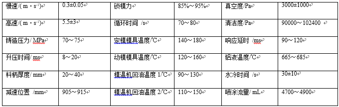 表1:鑄件1部分壓鑄機參數設定 2、壓鑄過程控制要點 2.1 壓鑄過程中噴霧流量的控制 壓鑄過程中噴霧流量通過動、定模分開檢測,動模控制在3 200 mL,定??刂圃? 200 mL。并且分開給動、定模流量設定上下偏差值,由于選用的電磁流量計精度為50 mL,設定偏差為±200 mL,200mL是減少1支噴槍后的實測值。生產過程中,如超出偏差值,將會直接輸出報警信號,停止壓鑄生產循壞。因此,可以有效預防由于噴槍堵塞造成的噴涂不到位,從而引起粘模與燒傷。 2.2 鋁液溫度的過程控制 由于使用保溫爐的保溫效果好,但升溫速度相對定量爐較慢,所以對于鋁液的來料溫度需要進行控制。選擇鋁液澆注溫度為675±10℃,因此鋁液在運輸澆包中的來料溫度,必須保持在700 ℃以上。低于此溫度加料,會影響鋁液在填充過程中的流態,造成局部位置氣孔比例上升。高于730 ℃加料會導致模具表面燒損粘鋁嚴重,影響鑄件的外觀質量。針對保溫爐設定鋁液溫度報警,澆注溫度如不在范圍內,保溫爐報警,并停止壓鑄生產循環,可以有效預防因鋁液溫度偏差產生的缺陷。 2.3 真空度控制 由于鑄件1模具采用動定模密封膠條密封,所有頂針及型芯針都采用涂抹密封膠來密封,料槽也使用整體料槽,但沖頭未使用專用的密封沖頭,而改用加長版沖頭(加長至150 mm)。在如此密封情況下,真空度設定超過4 kPa就報警(4 kPa是根據產品生產過程中能保持較高合格率而設定的一個經驗報警值),一般做到真空度2. 3k Pa附近。清潔度和堵塞值,一般都接近101 kPa,設定報警值是9 0 kPa(90 kPa是根據廠內過濾罐的清潔周期來設定的)。一個清潔周期的末期,真空閥過濾罐要及時清理,不清理會影響抽真空效果。真空罐設定值是1 kPa,一般都在2.2~400 Pa之間。只要超出要求值就會報警,使壓鑄機停機。 2.4 壓射實際參數的監控 壓鑄機采用國產宇部1650T機型,除了有自帶的壓鑄機參數控制系統外,還使用了二維碼追溯系統(廠內稱為MES系統),連接壓鑄機和周邊輔助設備,使得MES系統可以實時讀取每一模的生產參數,并反饋給云端,在云端進行比對(云端比對值是提前按要求輸入云端,并按照不同參數實際達成情況輸出不同的范圍值,比如慢速就是±0.05 m/s,高速就是±3 m/s等,見表2),比對后超出區間的產品,會被系統鎖定,判定為不合格。云端大數據還會定期根據更新的數據量計算產品的報廢與參數的變化之間的實時關系。找出一段時間內引起廢品率波動的原因,提高了保持產品合格率,壓鑄生產過程中有波動,可以快速排查找出問題點,有效促進現場良性循環。