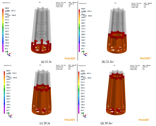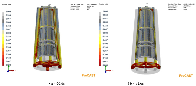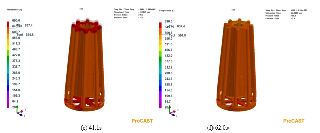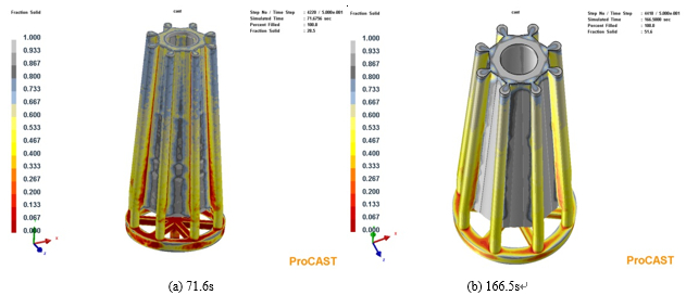 圖6:充型過程模擬 殼體采用底注式低壓澆注方法,澆注初始階段,合金液首先通過直澆道、橫澆道,然后進入8處立筒縫隙澆道,當縫隙澆道中的合金液面高于殼體型腔底部時,合金液開始充填鑄型型腔,直到充型全部結束。整個充型過程,立筒縫隙澆道中合金液溫度始終高于同高度鑄型型腔內合金液的溫度,立筒縫隙澆道對殼體補縮通道暢通,使殼體按照順序凝固的方式凝固,減少了殼體鑄造缺陷,保證了殼體的內部質量。 圖7為殼體凝固過程模擬及固相分數。固相率為0.7為縮孔、縮松形成的臨界值。伴隨合金液充型,型腔內合金液凝固,立筒縫隙澆道內合金固相分數始終低于同高度的型腔內合金固相率,利于殼體順序凝固過程的補縮。殼體凝固過程溫度場與充型過程的溫度場分布基本一致,立筒澆道之間的薄壁區合金液最先進入固相區,固相率較大,而立筒前部位及環筋等厚大部位仍高于液相線,固相率較小,補縮已進入固相區的部位,立筒澆道、凸臺及環筋等處最后進入固相區,立筒澆道前及環筋等處具有形成疏松、縮孔的傾向,見圖7和圖8。