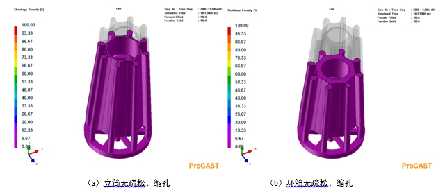 圖8:疏松、縮孔缺陷 對數值模擬結果初步分析可知:位于立筒澆道前部位及環筋等處是最后凝固部位,易出現疏松、縮孔缺陷;立筒澆道前屬于過熱區,環筋屬于殼體厚大部位,初步判斷為澆注過程中保壓壓力偏小、保壓時間偏短等因素造成。 4.4 模擬驗證 按照初次數值模擬的分析結果,疏松、縮孔缺陷為澆注過程中保壓壓力偏小、保壓時間偏短造成的。因此將殼體澆注時的保壓壓力由35 kPa增加到50 kPa,保壓時間由300 s增加到360 s,并進行模擬驗證,見圖9。模擬驗證結果顯示殼體鑄件凝固過程無明顯疏松、縮孔缺陷,同時也驗證了模擬結果分析。