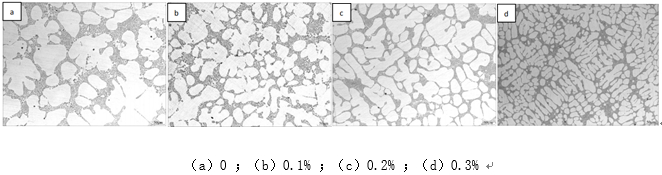 表4:主要熔煉鑄造工藝參數 2、添加Al-Ti-B細化劑及保溫時間對鋁合金組織的影響 鋁合金在金相下通常有3種晶粒形態,分別是柱狀晶、等軸晶和細晶組織。柱狀晶嚴重影響材料的強度和韌性,細小的等軸晶會降低熱裂紋傾向,但粗大的等軸晶也會降低材料的力學性能。在鋁合金壓鑄過程中,都會產生下腳料,下腳料都會作為回爐料按照一定的比例進行重熔后再次使用,在反復重熔的過程中,會造成鋁合金液的質量下降,影響合金的力學性能。因此,通過添加Al-5Ti-1B細化劑,細化組織,改善鋁液質量。通過添加Al-5Ti-1B細化劑后,鋁合金液保溫時間對其衰退效果的對比最終確定最佳的變質時間。 2.1 Al-5Ti-1B細化劑添加前后對比 對添加Al-Ti-B細化劑前后的鋁合金液進行取樣對比分析,見圖1??梢钥闯?,添加Al-5Ti-1B細化劑的試樣內部組織比較細小,而未添加Al-Ti-B細化劑的晶粒相對比較粗大。而且隨著添加量增加,晶粒尺寸進一步細化。
