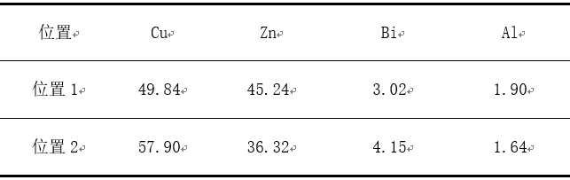 2、試驗結果與分析 2.1 鉍黃銅閥體零件正常部位和貫穿裂紋處斷面的化學成分 使用掃描電鏡和能譜儀對鉍黃銅閥體零件的正常部位和貫穿裂紋處斷面的化學成分進行選區分析,結果見表1和表2。在使用能譜儀進行定性分析時,試驗所用的能譜儀的檢測下限約為0.1%。在閥體零件的正常部位處沒有檢測到Bi元素的存在,說明在所測正常部位區域Bi元素的含量<0.1%;而在閥體零件存在貫穿裂紋的斷面處Bi元素的含量為3%~4%。比較Bi元素在正常部位和存在裂紋部位的所測含量,說明鉍黃銅閥體零件在低壓鑄造時Bi元素發生了嚴重的區域偏析。