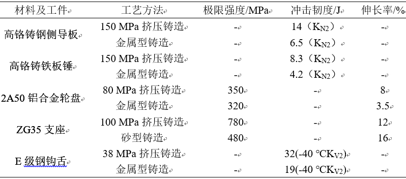 (a)金屬型,(b)150MPa擠壓鑄造 擠壓鑄造大型結構件在上述組織細化和致密化的基礎上,產品的強度和韌塑性同步提高,見表1。1700 mm×150 mm×60 mm的卷取機側導板,單重為350 kg,材質為高鉻鑄鋼ZG55Cr18Mo3NiV, 名義比壓150 MPa壓力下擠壓鑄造可以使沖擊韌性提高到14 J,比重力金屬型鑄造提高了1倍以上。694 mm×300 mm×110 mm的1214高鉻鑄鐵板錘,150 MPa名義壓力下擠壓鑄造可以使沖擊韌性提高到8 J以上,比重力金屬型鑄造提高了1倍以上。特種車輛負重輪材質為2A50,在80 MPa壓力下擠壓鑄造強度和塑性比金屬型鑄造都有顯著提高,其極限強度可達350 MPa,同時伸長率為8%;鑄鋼ZG35大型橋梁支座100 MPa擠壓鑄造的強度比砂型鑄造提高了300 MPa,伸長率依然保持在12%的水平。真實比壓38 MPa下擠壓鑄造E級鋼鉤舌的-40 ℃沖擊韌度高達32 J,比金屬型鑄造提高了僅1倍。