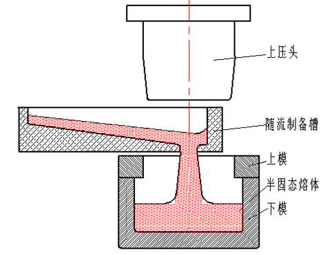 圖6:間接-直接復合擠壓鑄造示意圖 2.3 隨流半固態擠壓鑄造 隨流半固態擠壓鑄造是順應大型結構件必須使用流槽澆注而發明的一種半固態擠壓鑄造方法,見圖7。其借鑒了低過熱斜坡冷卻法半固態漿料制備原理,與擠壓鑄造相結合成為一種擠壓鑄造新技術。 大型結構件的質量大,一般都需要流槽澆注。大型結構件熔體的熱容量大,澆注過程溫降小,因此可以采用較低溫度澆注。因此,就可以使溫度在液相線附近的金屬液流經具有非自發形核作用的導流槽的過程中,形成含有一定固相的半固態合金熔體,在這種剪切稀化的流變過程順利進入型腔,隨后進行高壓凝固和補縮。這種方法利用了半固態合金剪切稀化的流變特性,不需要過大的比壓就可以實現充型和致密化。利用這種方法可以方便地生產半自磨機襯板、球磨機襯板、破碎機板錘等板型件。