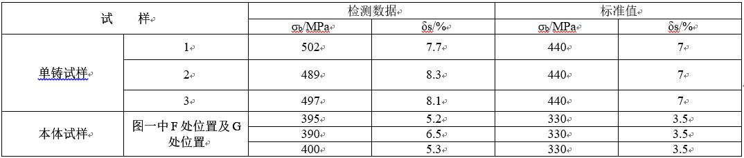 表1:實(shí)測化學(xué)成分與GB/T 1173-1995標(biāo)準(zhǔn)對比 1.4 澆注 根據(jù)ZL205A基座鑄件鑄件澆注溫度選取范圍為675~680 ℃、充型速度υ升取2 cm/s、充型時(shí)間為65~75 s之間。在確定好澆注參數(shù)后,將澆注參數(shù)錄入型號為LPC-DV08-NH的低壓鑄造液面加壓控制系統(tǒng)中。 2、內(nèi)部品質(zhì)檢測與性能測試 2.1 X射線探傷檢測及表面質(zhì)量檢查 采用XXQ-2005型攜帶式工藝X射線探傷機(jī)對鑄件進(jìn)行檢測,檢測結(jié)果分別見表2與圖5與圖6。