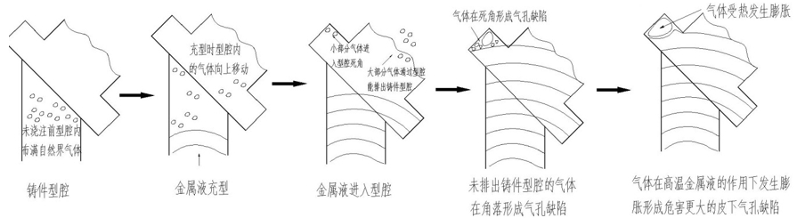 表3:鑄件力學(xué)性能檢測結(jié)果 3、基座缺陷原因分析 金屬液進(jìn)入型腔,空氣被加熱,出現(xiàn)向上排出鑄型的現(xiàn)象,很小的一部分空氣進(jìn)入了型腔的死角,在金屬熔液熱力作用下膨脹長大,形成危害性較大的氣孔缺陷,見圖7。