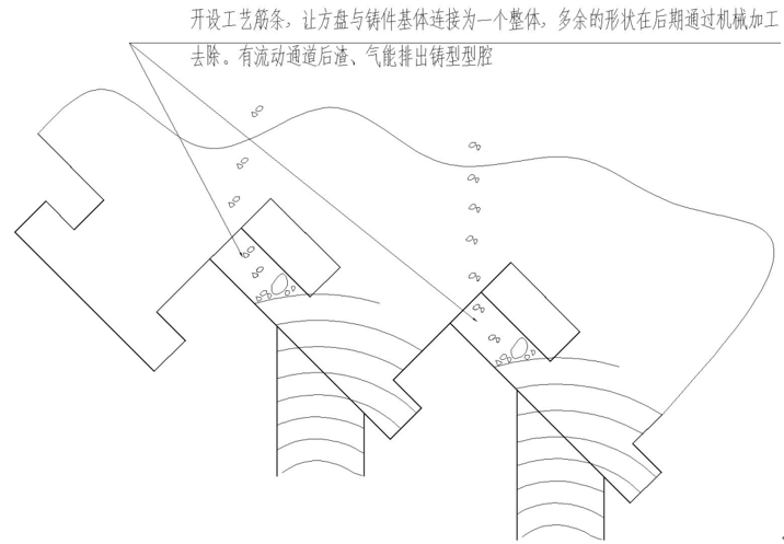 圖7:氣孔缺陷形成過程 基座鑄件的樹脂砂鑄型整體高度達(dá)到了1400 mm以上,鑄件型腔復(fù)雜、轉(zhuǎn)角較多,升液速度設(shè)置過快,合金熔液在型腔內(nèi)產(chǎn)生紊流卷氣;合金熔液流動距離遠(yuǎn),到達(dá)鑄型頂部的熔液溫度很低,不利于氣、渣排出鑄件型腔,易于在鑄件中上部產(chǎn)生夾渣及氣孔等缺陷。 基座鑄件頂部左右兩側(cè)的縫隙澆道間距很近,澆注時(shí)鑄件頂部縫隙澆道周圍過熱而導(dǎo)致鑄件頂面處安裝邊產(chǎn)生疏松、縮孔缺陷;同時(shí)鑄件頂部是型腔中渣、氣聚集區(qū),氣和渣阻礙縫隙澆道對鑄件的補(bǔ)縮,加重了鑄件產(chǎn)生疏松、縮孔缺陷的情況。 4、解決措施 針對基座鑄件方盤上部產(chǎn)生氣孔的原因,從鑄造工藝上優(yōu)化鑄件局部結(jié)構(gòu),讓渣、氣有時(shí)間、條件沿著開設(shè)的工藝通道排出型腔或進(jìn)入鑄件加工余量范圍內(nèi),有利于減輕鑄件產(chǎn)生渣氣孔缺陷的概率(見圖8)。