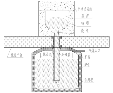 圖1:基座鑄件示意圖 鑄件輪廓尺寸為918 mm×750 mm×305.6 mm,結(jié)構(gòu)復(fù)雜且鑄件多個(gè)形狀只能通過下芯鑄出;壁厚差異較大,最薄壁厚為16 mm、最厚壁厚達(dá)到了42 mm,鑄件熱節(jié)分散且相互干涉,因此難以實(shí)現(xiàn)順序凝固,給鑄造工藝設(shè)計(jì)帶來很大的困難。 1.2 基座鑄造工藝方案設(shè)計(jì)及參數(shù)選擇 基座鑄件結(jié)構(gòu)較復(fù)雜,鑄件熱節(jié)多且分散,采用重力澆注很難保證鑄件熱節(jié)處不產(chǎn)生縮孔或疏松。采用低壓鑄造澆注ZL205A合金基座,其基本原理見圖2。其原理是在裝有金屬液的坩堝中,通入干燥的惰性氣體,使金屬液沿著升液管自下而上通過澆道進(jìn)入型腔,待金屬液充滿型后,增大氣壓,使液面上的氣體壓力保持至鑄件完全凝固,然后解除壓力,開型后獲得所需的鑄件。
