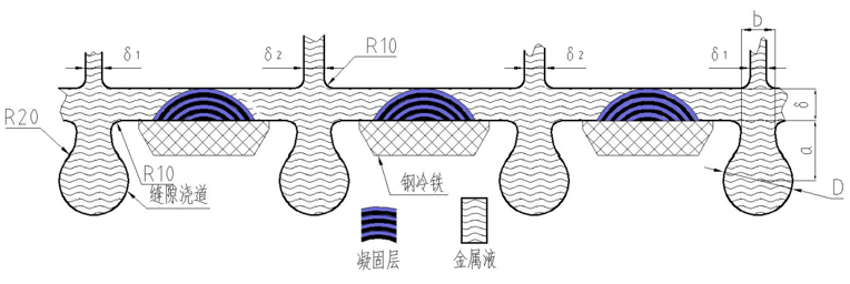 式中,Ag為內(nèi)澆道截面積,cm2;W為鑄件質(zhì)量,g;ρ為合金密度,g/cm2;υ是內(nèi)澆道出口線速度,cm/s;保證金屬液平穩(wěn)充型,υ值應(yīng)不大于15 cm/s;t是充型時(shí)間,s,按合金在型內(nèi)上升速度計(jì)算,t=h/υ升(h為型腔高度,cm),υ升=1~6 cm/s。t 用UG三維模型估算鑄件澆注質(zhì)量約為490 kg,采用縫隙式澆道進(jìn)行補(bǔ)縮,見圖4??p隙澆口最小厚度b選擇取1.15δ,縫隙圓棒采用上小下大形式,小端直徑D取值為2.5b,斜度為1.5°,縫隙圓棒中心線至鑄件外壁距離a取60 mm。在相鄰兩道縫隙澆道之間安放專用鋼冷鐵,冷鐵兩端倒角斜角,冷鐵厚度為1.3δ??p隙式內(nèi)澆道數(shù)量為8根,間距取為200~220 mm。