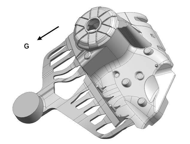圖7 局部激冷后得到的健全鑄件 4、結(jié)論 (1)設(shè)計(jì)、優(yōu)選出大型、復(fù)雜汽車結(jié)構(gòu)件——鋁合金減震塔的壓鑄澆注系統(tǒng)及溢流和排氣系統(tǒng)。 (2)利用數(shù)值模擬方法分析了減震塔零件的卷氣發(fā)生部位和區(qū)域,預(yù)測(cè)了壓鑄缺陷的種類及位置,以此為基礎(chǔ)更改了澆注系統(tǒng)的設(shè)計(jì)。 (3)在壁厚尺寸較大圓形結(jié)構(gòu)處容易發(fā)生卷氣現(xiàn)象和縮孔缺陷,采用局部激冷方法等工藝措施,消除了缺陷,獲得整體質(zhì)量良好的鋁合金減震塔壓鑄件。