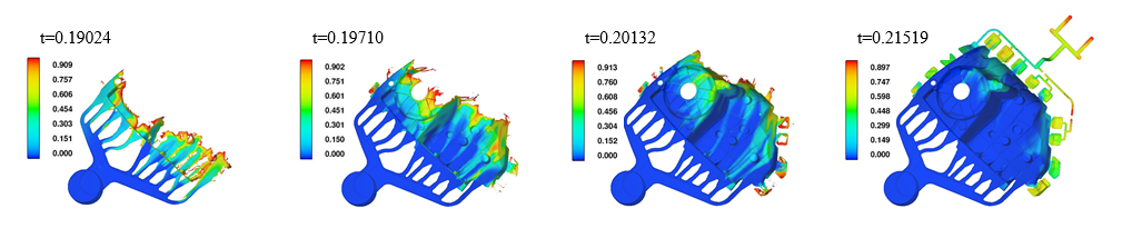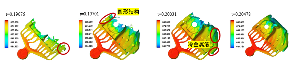 卷氣(色標(biāo)代表卷入氣體體積分?jǐn)?shù)):(a)t=0.190s; (b)t=0.197s; (c)t=0.201s; (d)t=0.215s. 圖5為金屬液在帶有澆注系統(tǒng)以及溢流槽、排氣槽的壓鑄模具中的充型過程。可以看出,在金屬液充型過程中,位于液-氣界面前沿的溫度較低、卷氣嚴(yán)重的部分金屬液全部進(jìn)入設(shè)計(jì)好的溢流槽中,金屬液充滿型腔后(圖5(d)),留在零件內(nèi)部的氣體量極少。因此,設(shè)計(jì)的溢流槽、排氣槽適用于該減震塔零件的壓鑄工藝。