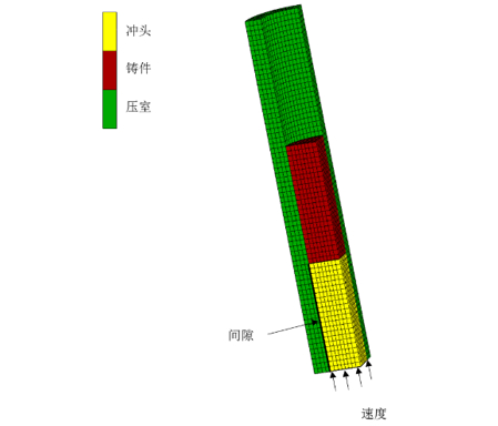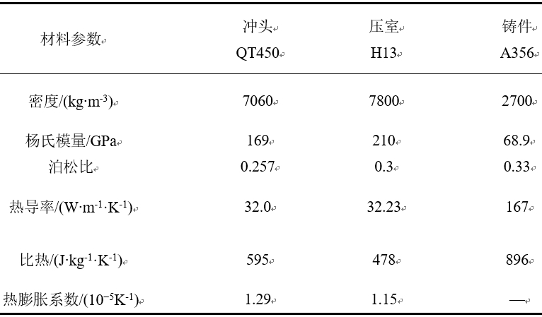 表1:各組件的材料參數 后處理中,選取沖頭內部距離上表面10 mm處的節點,壓室上的節點對應于沖頭該節點的路徑,從而便可以得到壓射機構的實時間隙值(Ci)和換熱溫差(Td);并且定義間隙率(Rg)為實時間隙與初始間隙的比值,用來對比在不同參數下的間隙變化程度。