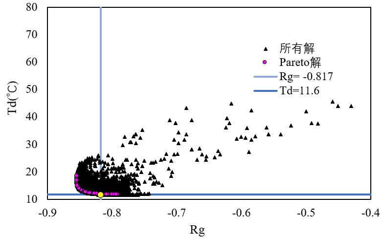 表2:Kriging元模型在各指標下的結果 4.2 多目標優化結果 采用NSGA-Ⅱ算法實現對工藝參數的多目標尋優,獲取這兩個優化目標間的折中解。圖7為多目標優化解,包括Pareto解。最后選取的最優加工目標的工藝參數分別為701、338、16、0.1061、56,間隙率和換熱溫差分別為-0.817、11.6。