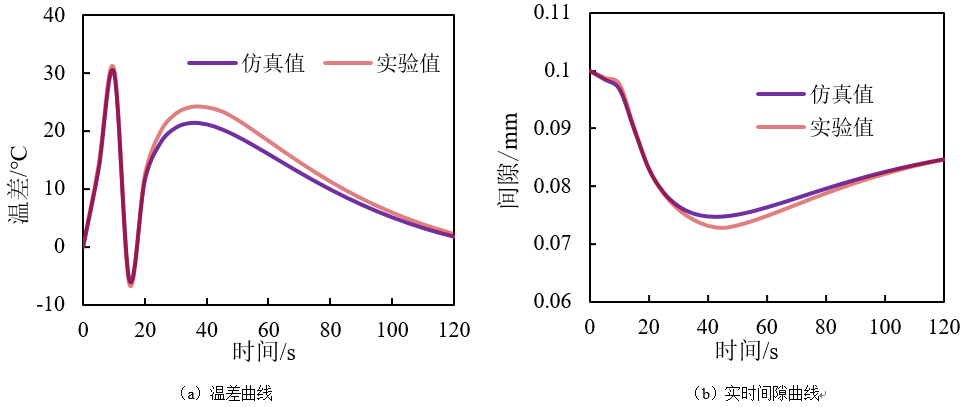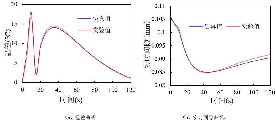 1.壓室;2.預熱圈;3,4,5.千分尺測距儀;6.沖頭;7.應變片;9.底座;10.推桿;8,11,12,13,14.熱電偶;15.鑄件 圖3:壓射機構裝配圖: 2.2物理試驗與仿真試驗的對比 壓射機構的充型過程在120 s內完成,因此按照式(1)和式(2)計算得到圖4的趨勢圖。從圖4可以看到,有限元仿真值與物理試驗有相同的趨勢;間隙率的最大誤差不超過5%,溫差的最大誤差不超過12%。實際中鑄件在澆注時溫度變化較快,即試驗中鑄件溫度與模擬所設置參數可能存在出入,因此,可認為該數據在誤差范圍內,有限元仿真準確有效。另外,在20 s之后,溫差和實時間隙都出現了極值,且趨勢一致,表明溫差對實時間隙存在約束作用。仿真得到換熱溫差和間隙率分別為21.2、-0.749;試驗得到換熱溫差和間隙率分別為24.1、-0.73。