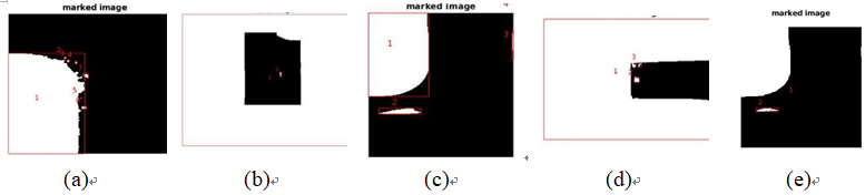 圖8:氣孔缺陷的特征提取效果 其中,缺少了閾值處理后得到的第三張圖片(氣孔缺陷c),見(jiàn)圖8c,因?yàn)閳D像被光源污染,導(dǎo)致最后只能提取出來(lái)一大片的白色區(qū)域,所以最后沒(méi)有展示出來(lái)。圖像中氣孔的面積和周長(zhǎng)特征提取到的具體值見(jiàn)表1。