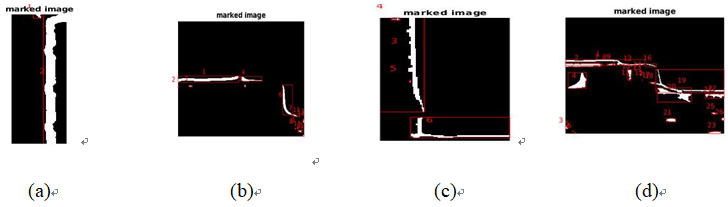表1:缺陷面積以及周長(zhǎng) 圖8a中有一連串的氣孔,普遍面積較小,并且有一部分氣孔被白色光源污染導(dǎo)致無(wú)法被提取。其他氣孔的面積和周長(zhǎng)都被很好的提取出來(lái)了,如果在拍攝圖像的時(shí)候?qū)ο袼攸c(diǎn)的長(zhǎng)度進(jìn)行標(biāo)度,也就能直接得到氣孔缺陷的面積和周長(zhǎng)了,對(duì)后續(xù)的工藝分析能夠提供幫助。 然后展示對(duì)夾渣缺陷面積和周長(zhǎng)的特征提取,同樣首先先對(duì)圖像中的缺陷部位進(jìn)行捕獲,見(jiàn)圖9。