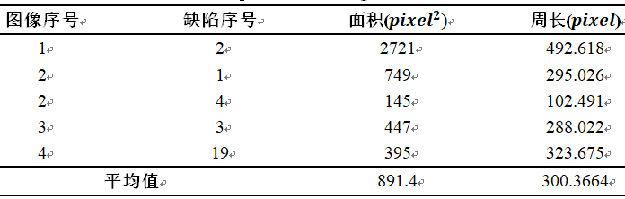 圖9:夾渣缺陷的特征提取效果 從圖9可以看出,提取效果整體較好,但會(huì)出現(xiàn)一些過(guò)度提取的情況,這個(gè)時(shí)候需要人工來(lái)幫助判斷具體哪一個(gè)部分才是真正的夾渣缺陷。表2為提取到的缺陷的周長(zhǎng)和面積。
