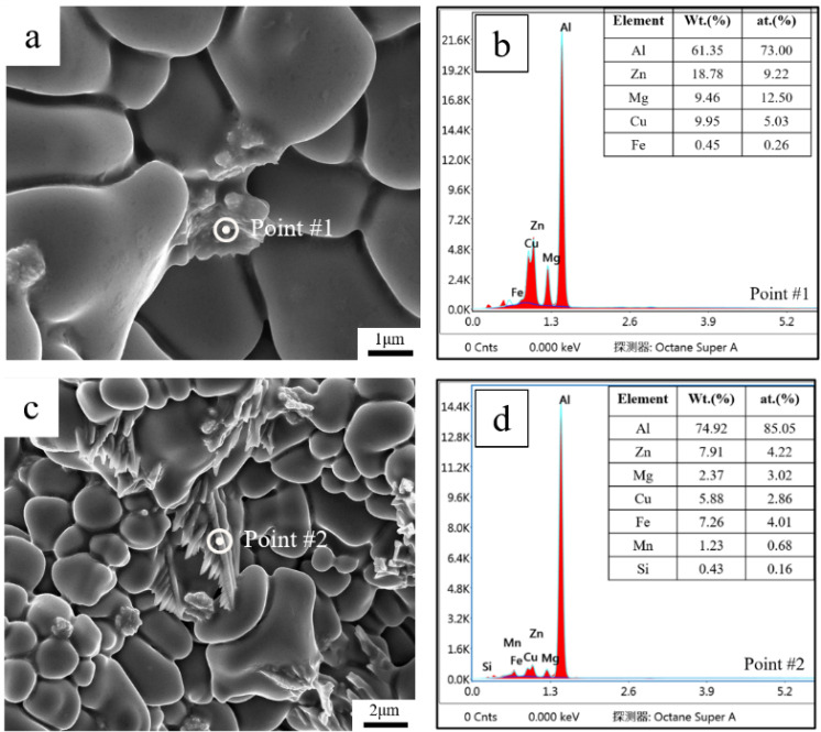 圖7 斷口表面顆粒物高倍圖及EDS結果 圖 5為對斷口徑向取樣示意圖。對斷口徑向約為0R處中心區域組織進行顯微觀察,結果見圖 6,在不同的增壓比壓下初生α-Al晶粒都比較完整,表明熱裂在該區域為典型的脆性沿晶斷裂特征。同時在斷口上均有著不規則顆粒物存在。經辨別可分為兩種:團簇狀斷裂尾梢和片狀析出組織。圖 7為兩種不規則顆粒物的高倍圖及其EDS測試結果。由圖 7a可知該斷裂尾梢主要產生在多個晶粒交匯處的晶界,裂紋形成功理論認為裂紋的形核通常發生在固相晶粒相交的液相匯集區,由于溶質再分配在晶界成分偏析,引起液相在匯集區域的雙邊角發生變化,液體雙邊角越小,裂紋形成越容易。由EDS測試結果也可知,該斷裂尾梢的Zn、Mg、Cu成分偏析十分嚴重,Zn質量分數甚至達到了18.78%,而在Al-Zn-Mg-Cu合金中,合金的熱裂傾向幾乎與Zn含量成正比關系。圖 7c為條狀析出相的高倍圖,該析出相由若干條狀組織聚集形成,在斷口表面分布很少。由EDS分析可知該析出組織的Fe含量仍然相對基體(表 1)較高,基體與析出組織中Fe質量比分別為:0.51%,7.26%。Fe元素在鋁合金中可以形成較多的物相,如Al6Fe、Al3Fe、Al7Cu2Fe等金屬間化合物,這些物相主要以不溶或難溶的脆性相存在。當Fe元素在鋁合金中含量達到0.3%以上則會形成粗大的針片狀含鐵相,相較脆且嚴重割裂基體,與基體的結合強度低,易剝落。 圖 8為斷口徑向約為1.0R處邊緣區域顯微組織,在不同的增壓比下壓鑄件斷口邊緣均存在大量的韌窩。在宏觀上Al-Zn-Mg-Cu合金流變壓鑄試樣斷口呈脆性斷裂特征,局部區域也可以有塑性變形,表現為韌窩。該斷裂形式可判斷為微孔聚集型斷裂,為一種延性斷裂。表現為宏觀脆性微孔型斷裂,該類斷裂通常出現在高強度材料裂紋試樣在常溫拉伸,裂紋擴展時材料的韌度不足時發生,微觀組織形貌為細小均勻分布的等軸狀微孔。圖 9為韌窩高倍微觀形貌圖,其中最大韌窩直徑可達28 μm以上,在該韌窩底部可見有裂紋及析出相存在。
