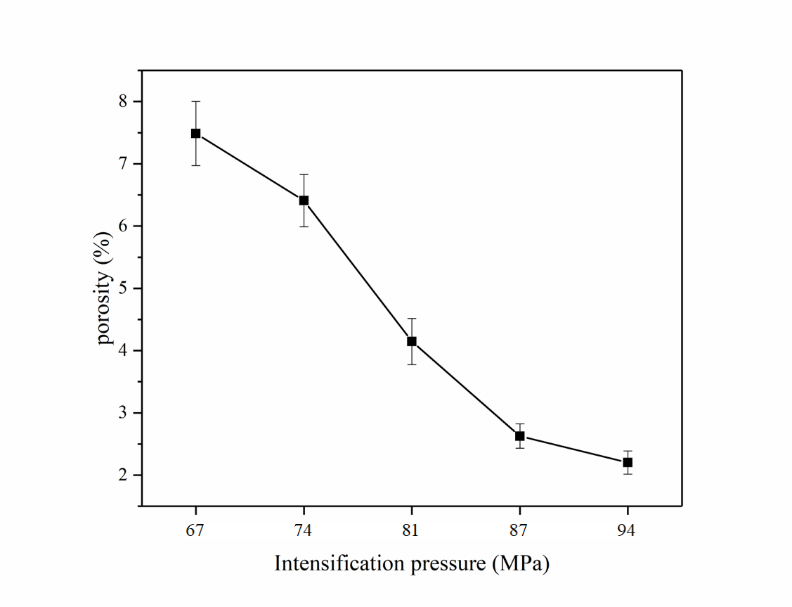 圖14 Al-Zn-Mg-Cu合金鑄件組織縮孔位置微觀組織 提高增壓比壓可以有效對凝固末期進行收縮補償,減少孔洞缺陷的產生,提高鑄件的整體致密度。持續增大增壓比壓,對鑄件的孔隙率減少效果下降。增壓的同時會給金屬液一個沖擊力的作用,當增壓比壓過大時,可能會導致正在凝固的組織發生開裂現象,加劇熱裂傾向。平行段區域直徑更小,孔洞減少應力的有效承載面積,更容易導致熱裂發生于該區域。靠近澆口區域往往凝固時間較長,有著更好的補縮效果,因此孔洞較少,但同時由于未完全凝固的組織性能較差,過大的增壓比壓更容易使得近澆口處區域所受應力超過臨界值而開裂,提高熱裂傾向。 3、結論 (1)Al-Zn-Mg-Cu合金流變壓鑄件熱裂傾向隨增壓比壓增大呈先減小后增大的趨勢,在增壓比壓為87 MPa時,鑄件有著最小的熱裂傾向值15。 (2)鑄件內部孔洞缺陷對熱裂傾向程度影響最為關鍵,是導致裂紋形成的主要原因。孔洞主要來源于補縮不足,增壓比壓為67~94 MPa時,提高增壓比壓可以有效降低孔隙率。