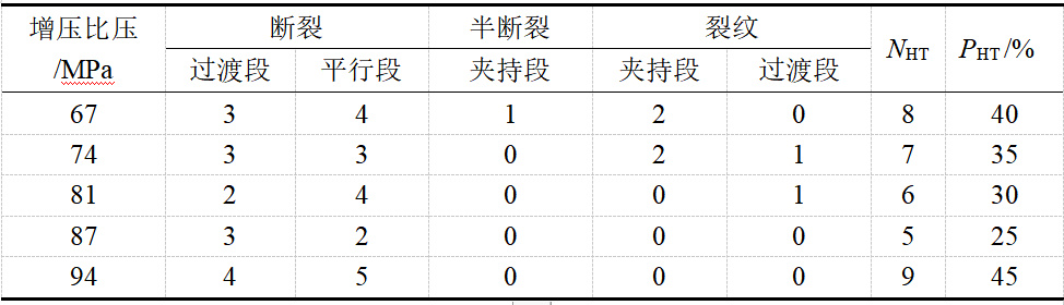 表2 試樣熱裂數量及概率 表 2為不同增壓比壓下Al-Zn-Mg-Cu合金流變壓鑄試樣的熱裂紋分布及統計結果。可以看出,在不同的增壓比壓下,試樣的熱裂以斷裂形式為主。斷裂主要產生在試樣的過渡段和平行段,夾持段未發生斷裂行為。在不同增壓比壓下兩個區域斷裂產生的數量相差很小,平行段斷裂數量要略高于過渡段。將熱裂評定試樣結果統計轉換為熱裂傾向值HTS,結果見圖 2。可知隨著增壓比壓增加,Al-Zn-Mg-Cu合金流變壓鑄試樣的熱裂傾向值HTS呈先減小后增大的趨勢。在增壓比壓為87 MPa時,HTS最小為15,當增壓比壓提升至94 MPa時,HTS最大為27,有著最為嚴重的熱裂傾向。