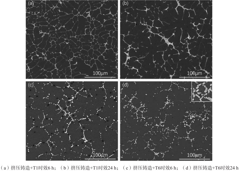 試驗合金為Mg-5Zn-2.5Cu-0.4Zr鎂合金,經電阻爐720~740 ℃熔煉而成,其中Zn、Cu以純金屬形式加入,Zr以Mg-30Zr中間合金的形式加入,熔煉期間通入1vol.%SF6+99vol.%N? 混合氣體進行保護。為了研究成形工藝對合金熱物理性能的影響,分別通過擠壓鑄造和重力鑄造的方式得到鑄錠。擠壓鑄造時保壓壓力為100 MPa,保壓時間90s。擠壓鑄造獲得的鑄錠尺寸為Φ35 mm×90 mm,重力鑄造獲得的鑄錠尺寸為Φ35 mm×120 mm。為了對比不同時效工藝對合金熱物理性能的影響,對擠壓鑄造得到的鑄錠分別進行T1人工時效處理和T6時效處理。T1時效處理溫度設定為180℃,時效時間分別為6h和24h;T6熱處理工藝為真空爐中430 ℃等溫24 h后淬火,后進行180℃的時效處理,時效時間分別為6h和24h。從得到的鑄錠頂部中心部位取合適大小的合金鑲嵌制得金相試樣,使用4vol.%硝酸酒精溶液進行腐蝕,腐蝕時間3~5s,利用Nova Nano SEM 450場發射掃描電鏡拍攝合金的顯微組織圖片。 采用日本島津公司生產的X射線衍射儀(XRD-7000)獲得合金試樣的衍射圖譜。測試用的靶材為Cu靶,掃描角度范圍為10°~90°,掃描速率為10°/min。采用LFA-427型激光導熱儀測量不同工藝下合金的室溫熱導率,試樣尺寸為Φ12.7 mm×2.5 mm,以保證一維傳熱狀態。利用耐馳公司的DIL402型熱膨脹儀測量材料的熱膨脹系數,測試溫度區間為20~100 ℃,升溫速率10 ℃/min。 2、試驗結果及分析 2.1 合金組織與物相分析 圖1a、b分別是擠壓鑄造和重力鑄造獲得的Mg-5Zn-2.5Cu-0.4Zr合金的微觀組織圖像。從圖中可以看到,重力鑄造得到的合金由α-Mg與分布在晶界的第二相組成,少量第二相在晶粒內部彌散分布。從圖3的XRD衍射圖譜可知,擠壓鑄造并沒有改變合金的相組成,兩種成形工藝得到的合金主要組成相均為α-Mg和MgCuZn相。但是,對比擠壓鑄造和重力鑄造得到的合金的微觀組 織可以發現(圖1),重力鑄造制備的合金平均晶粒尺寸約為42 μm,擠壓鑄造將平均晶粒尺寸減小到18 μm。當金屬在壓力下凝固時,熔體與模具之間緊密接觸,熔體的熱量通過模具內腔迅速傳遞,從而獲得較高的冷速;另一方面,壓力使金屬的熔點升高,增大了形核過冷度,也使得擠壓鑄造的合金晶粒得到細化。