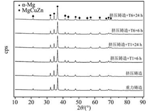 圖3 不同工藝狀態Mg-5Zn-2.5Cu-0.4Zr合金XRD圖 圖2 a、b分別是人工時效6 h和24 h后合金的微觀組織圖像,同鑄態的組織相比沒有明顯的變化,這是因為T1熱處理沒有經過固溶處理,再析出的合金元素與第二相有限,因此幾乎觀察不到組織變化。 圖2c、d分別是固溶+時效6 h和24 h后合金的微觀組織圖像,其中圖2d右上角是時效后第二相顆粒的形貌圖像??梢钥吹剑W狀的第二相已經消失,取而代之的是呈項鏈狀分布的顆粒第二相,且時效時間越久,顆粒狀第二相析出越多。不同時效時間處理后合金的XRD圖譜表明,時效處理并沒有改變第二相,析出的顆粒狀第二相仍是MgCuZn相。