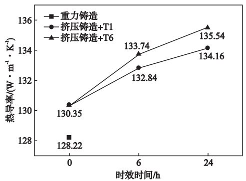 圖2 不同時效工藝Mg-5Zn-2.5Cu-0.4Zr合金SEM圖像 2.2 合金導熱性能分析 不同工藝下合金的熱導率如圖4所示。與重力鑄造制備的合金相比,擠壓鑄造獲得的合金熱導率更高。一方面擠壓鑄造減少了合金組織中氣孔的數目,氣孔的熱導率遠小于合金,因此擠壓鑄造的合金熱導率更高;另一方面,擠壓鑄造顯著減小了晶粒尺寸,雖然晶粒尺寸減小對于合金的熱導率是不利的 。但是MgCuZn相的分布更加連續,這對熱導率的提升是有幫助的。