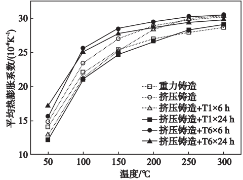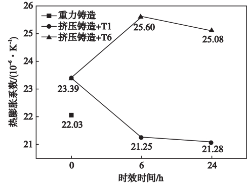 圖4 不同工藝狀態和時效處理時間下Mg-5Zn-2.5Cu-0.4Zr合金室溫熱導率 從圖4中可以看出不論是T1時效還是T6時效,合金的熱導率都隨時效時間延長而增大。對于T1時效處理的合金,時效時間為6 h時,熱導率從鑄態的130.35 W/(m·K)增大到132.84 W/(m·K);進一步延長時效時間至24 h,則熱導率增大到了134.16 W/(m·K)。T6時效處理的合金也表現出相同的趨勢,最終時效時間達到24 h時,合金的熱導率可以達到135.54 W/(m·K),略高于T1時效處理后合金的熱導率。 對比時效前后合金XRD圖譜中α-Mg三強峰的位置,發現時效處理后α-Mg三強峰對應的衍射角度更大,偏移角度約為0.1°。由布拉格衍射方程可知,衍射角越大,對應的晶面間距越小,這說明時效處理后α-Mg的晶格常數變小,晶格畸變的程度減輕。在時效過程中,固溶在α-Mg基體中的Zn原子會逐漸析出,減小了合金晶格畸變的程度,提高了合金熱導率。但是T1時效對合金熱導率的提升幅度小于T6時效的提升,這是由于T6時效相比T1時效多了一道固溶處理工藝。固溶處理一方面使Zn原子在α-Mg基體中達到過飽和狀態,為后續第二相的析出提供了驅動力;另一方面,固溶處理有效改善擠壓鑄造過程中產生的元素偏析現象,使得組織均勻化,增大了合金的熱導率。 2.3 合金熱膨脹性能分析