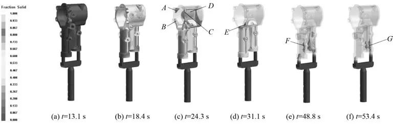 圖5 方案二的充型過程 在進行充型時,兩種方案都比較符合一般低壓鑄造的自下而上的填充,但是方案一在充型時鋁液在壁厚變化較大的部位出現臺階面,方案二較為合理,但還需再做進一步優化,且充型都提前完成,因此需要對壓力曲線進行修改。 3.2.2 凝固過程和缺陷的分析 在凝固過程中,金屬液在型腔中逐漸結晶,形成固液共存的狀態,金屬液存在一個臨界固相分數,當超過此臨界值,金屬液流動性將變差,以至于失去補縮能力,理論上取臨界固相分數值為0.7。因此對兩種方案的凝固過程主要分析固相率變化,方案一和方案二的凝固情況分別如圖6和圖7所示。