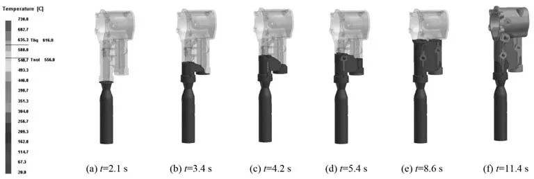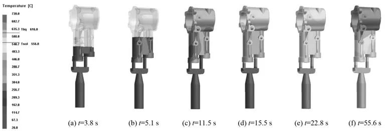 表2 冷卻水管參數 4.2 方案驗證 對優化后的工藝方案進行數值模擬,充型過程和凝固過程的溫度場如圖11所示。