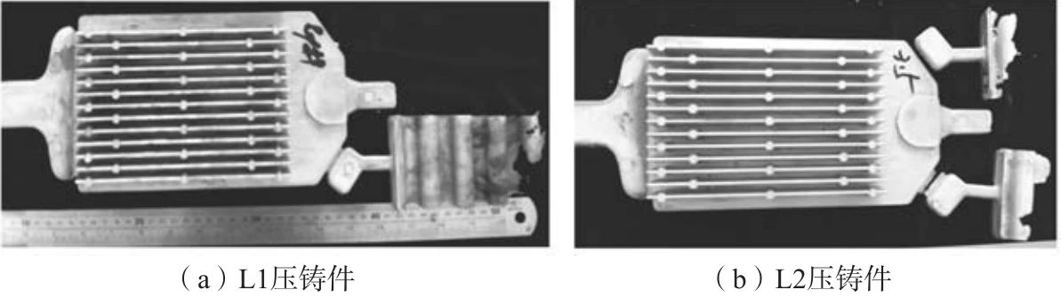 表2 壓鑄工藝參數 根據試驗目的分別設計了兩組試驗:試驗L1采用主、副排氣通道同時抽氣的新型真空抽氣系統進行壓鑄試驗;試驗L2只采用主排氣通道(齒狀排氣通道)進行壓鑄試驗。 3.2 真空壓鑄件組織性能分析 在相同工藝條件下,由試驗L1、L2獲得了真空壓鑄件,其宏觀照片如圖3所示。對比兩圖可知,試驗L1、L2獲得的壓鑄件外形都較為完整,試驗L2的壓鑄件約填充了2個齒形槽,而試驗L1的壓鑄件則填充了5.5個齒形槽,說明金屬液的充型能力得到明顯改善。對試驗L1、L2獲得的散熱器壓鑄件采用電火花線切割機制取金相試樣和拉伸試樣,金相試樣和拉伸試樣的取樣位置為散熱器的散熱片,見圖3,制得的拉伸試樣見圖4。