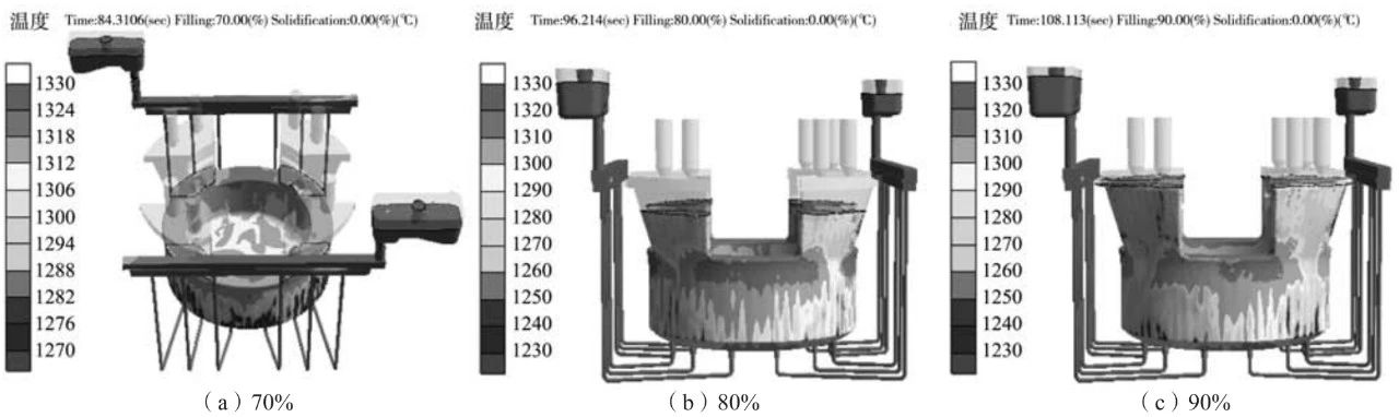 圖9 充型速度場 2.3.3 充型溫度場模擬 圖10為充型溫度場的仿真結果。從圖中可以看出,充型至70%時,底腳最低溫度為1 318 ℃,溫降為12 ℃;充型至80%時,底腳側面最低溫度為1 290 ℃,溫降為40 ℃;充型90%時,底腳側面最低溫度為1 270 ℃,高于液相線溫度1 187 ℃,充型良好。相比于首次,底腳位置加放冷鐵后溫降增加。