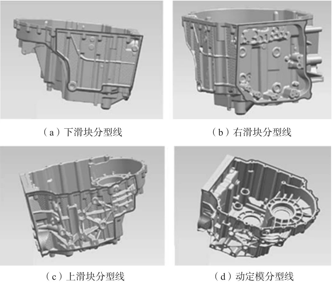 圖2 產(chǎn)品壁厚分析圖 2、模具設(shè)計(jì) 2.1?分型面的確立 壓鑄模中,分型面的選擇一般需保證開模后鑄件留在動(dòng)模側(cè),方便頂出,并設(shè)置在壓鑄件外形尺寸輪廓的最大斷面處。由于該產(chǎn)品結(jié)構(gòu)十分復(fù)雜,內(nèi)部的結(jié)構(gòu)無法直接成形,且與動(dòng)定模開模方向不一致的部位,這時(shí)候需要借助滑塊來成形。且產(chǎn)品需設(shè)置一定的脫模斜度,以便于后期的開模。上、下、右滑塊以及動(dòng)定模的分型面如圖3所示。其中圖3a是下滑塊的分型線,圖3b為右滑塊的分型線,圖3c為上滑塊的分型線,圖3d為動(dòng)定模的分型線。確定合適的分型面是模具設(shè)計(jì)的關(guān)鍵。