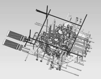 圖5 含冷卻系統(tǒng)的產(chǎn)品澆注系統(tǒng)圖 2.4?抽芯機(jī)構(gòu)設(shè)計(jì) 對(duì)于與分模方向不一致的側(cè)孔、側(cè)凹不易直接成形區(qū)域,一般采用抽芯結(jié)構(gòu)。壓鑄過程中,對(duì)于該變速箱外殼而言,開模順序?yàn)閯?dòng)定模分開后,先抽芯后頂出。如圖6所示,對(duì)于圖中標(biāo)方框的兩個(gè)側(cè)孔,由于其方向與開模方向不一致,具有一定的起模角度,因此這兩個(gè)位置均采用液壓油缸抽芯結(jié)構(gòu)成形。根據(jù)產(chǎn)品結(jié)構(gòu)特征,將這兩個(gè)液壓油缸抽芯結(jié)構(gòu)設(shè)置在動(dòng)模上。圖7為該產(chǎn)品的壓鑄模具圖。