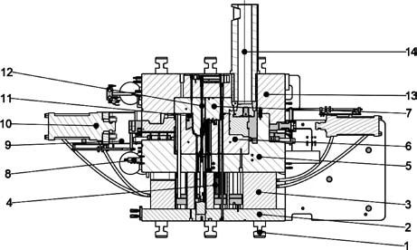 1.鎖模柱 2.底板 3.固定塊 4.頂針 5.動(dòng)???6.動(dòng)模芯 7.定模芯 8.集水器 9.油缸支架 10.油缸 11.活動(dòng)鑲塊 12.冷卻水管 13.定???14.熔杯 圖7 壓鑄模具平面布置圖 3、壓鑄機(jī)及工藝參數(shù)的選擇 3.1?壓鑄機(jī)的選型 壓鑄機(jī)選擇取決于壓射能量、壓室容量、鎖模力和模具安裝尺寸等。鎖模力,即用來克服壓鑄生產(chǎn)時(shí)的脹型力,從而鎖緊模具的分型面,以達(dá)到防止鋁液飛濺的目的。通常情況下,模具的鎖模力應(yīng)大于理論計(jì)算得出的脹型力。否則,模具無法鎖緊,型腔中的壓力無法保證,且鋁液在填充過程中容易從分型面溢出,產(chǎn)生飛邊等缺陷,嚴(yán)重影響著鑄件的尺寸精度。脹型力公式可用下式表示: