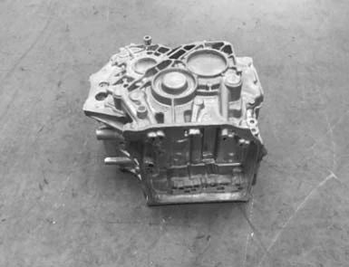 鋁液充填入型腔,壓射速度分為兩個(gè)階段:慢壓射速度和快壓射速度。慢壓射階段是指沖頭推動(dòng)鋁液前進(jìn)直至沖頭將壓室中的鋁液推入內(nèi)澆道的運(yùn)動(dòng)過程,快壓射階段是指鋁液充滿型腔時(shí)沖頭的壓射速度??靿荷渌俣扰c充型質(zhì)量有著十分密切的聯(lián)系,沖頭壓射速度過低,鑄件無法成形或成形品質(zhì)較差。提高壓射速度,從而提高熔融鋁液的流動(dòng)性,能避免流痕、冷隔等缺陷的產(chǎn)生。經(jīng)過多次實(shí)踐,該產(chǎn)品的最佳快壓射速度取4.5 m/s。內(nèi)澆道的壓射速度與快壓射速度的關(guān)系為: 式中:Vn 為內(nèi)澆道的壓射速度,m/s;An 為內(nèi)澆道面積,由式(1)得An =1 450 m㎡ ;Vk 為快壓射速度,選4.5 m/s;Ak 為壓室內(nèi)孔面積,壓室直徑為140 mm。經(jīng)計(jì)算,得內(nèi)澆道的速度為48 m/s。 4、壓鑄生產(chǎn)過程 本產(chǎn)品壓射過程分五個(gè)階段:①澆注階段;②低速填充階段Ⅰ(慢速封口);③低速填充階段Ⅱ,金屬液堆積;④高速切換與填充階段;⑤增壓壓實(shí)階段。 壓射過程結(jié)束后壓鑄機(jī)開模,同時(shí)靜模抽芯機(jī)構(gòu)抽芯-繼續(xù)開模、動(dòng)模抽芯-繼續(xù)開模并頂出壓鑄件-取件機(jī)械手取出壓鑄件-噴涂機(jī)械手噴涂脫模劑,完成一次壓鑄過程循環(huán)。圖8為最終鋁合金變速箱外殼壓鑄成品圖。變速箱外殼表面輪廓清晰,表面無飛翅、裂紋、氣孔、冷隔等缺陷。后續(xù)經(jīng)機(jī)加工后,在測試臺(tái)通過了高低壓測漏試驗(yàn)的驗(yàn)證。