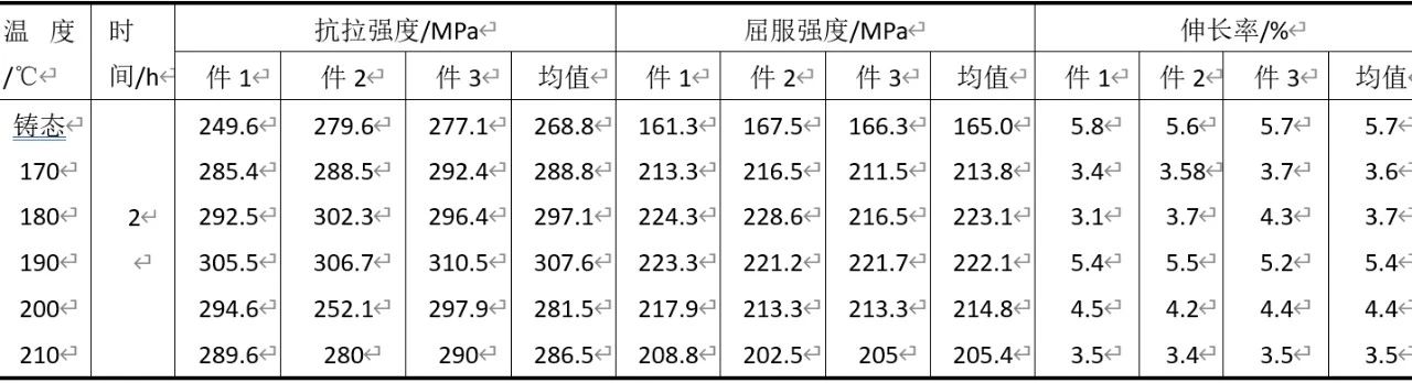 4、熱處理工藝效果 鋁合金鑄件熱處理目的是提高合金的力學(xué)性能,增強(qiáng)耐腐蝕性能,改善加工性能,獲得尺寸的穩(wěn)定性。鋁合金的時(shí)效硬化不僅決定于合金的組成、時(shí)效工藝,還取決于合金在生產(chǎn)過(guò)程中的缺陷,特別是空位、位錯(cuò)的數(shù)量和分布等,目前普遍認(rèn)為時(shí)效硬化是溶質(zhì)原子偏聚形成硬化區(qū)的結(jié)果。AlSi10MnMg薄壁壓鑄零件在T5及T6的適當(dāng)工藝參數(shù),都能得到較好的性能要求。由于固溶熱處理工藝較為復(fù)雜,并且較高的溫度容易導(dǎo)致薄壁壓鑄件變形超差,且薄壁該零件可以在2h可以得到均勻的溶解,因此以溫度為變量采用人工時(shí)效處理。 選取人工時(shí)效溫度范圍為170~210 ℃,每間隔10 ℃作為1組,保溫時(shí)間均為2 h。采用Sx2-12-6電阻爐進(jìn)行人工時(shí)效,額定功率為12 kW,爐膛尺寸為550 mm×550 mm×450 mm;將每組3個(gè)試片懸掛放置入爐膛中間部位,通風(fēng),升溫15 min到達(dá)規(guī)定時(shí)效溫度,隨后自動(dòng)保溫計(jì)時(shí),最后由人工將試片取出空氣中冷卻。 使用WDW-50E萬(wàn)能拉伸試驗(yàn)機(jī)在室溫條件下進(jìn)行拉伸測(cè)試,拉伸測(cè)試過(guò)程依據(jù)國(guó)標(biāo)GB/T228.1-2010,見圖10,伸長(zhǎng)率由卡尺測(cè)量拉伸前后數(shù)值計(jì)算獲得,每組3件,測(cè)試結(jié)果見表3。
